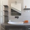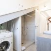 Piccolo bagno con doccia, sanitari al completo e lavatrice.